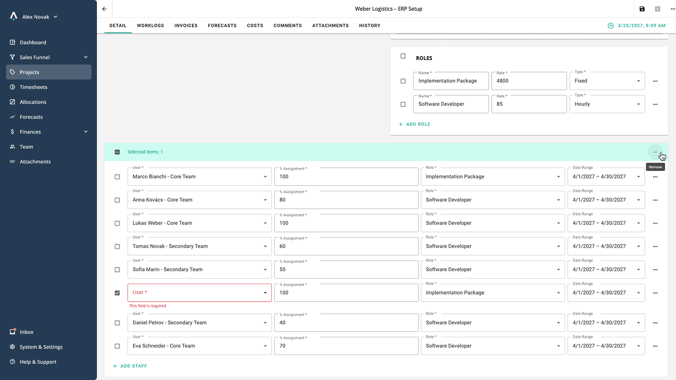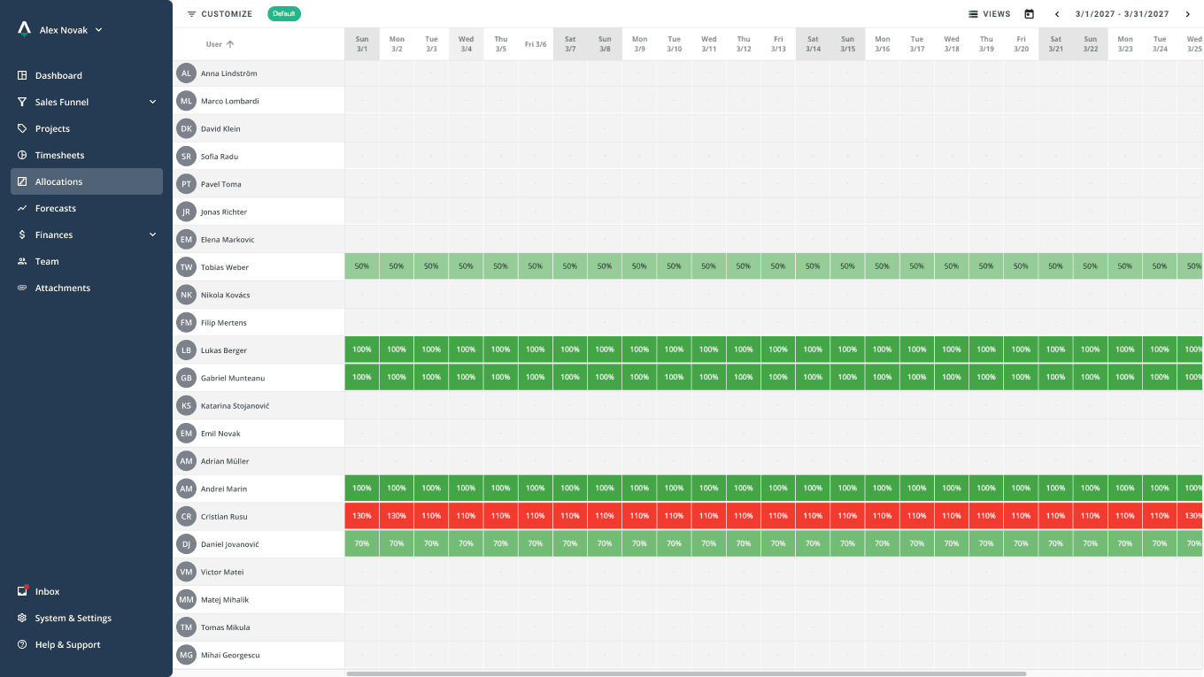 Every hour worked is visible, structured, and connected to a role and project — eliminating blind spots in delivery.