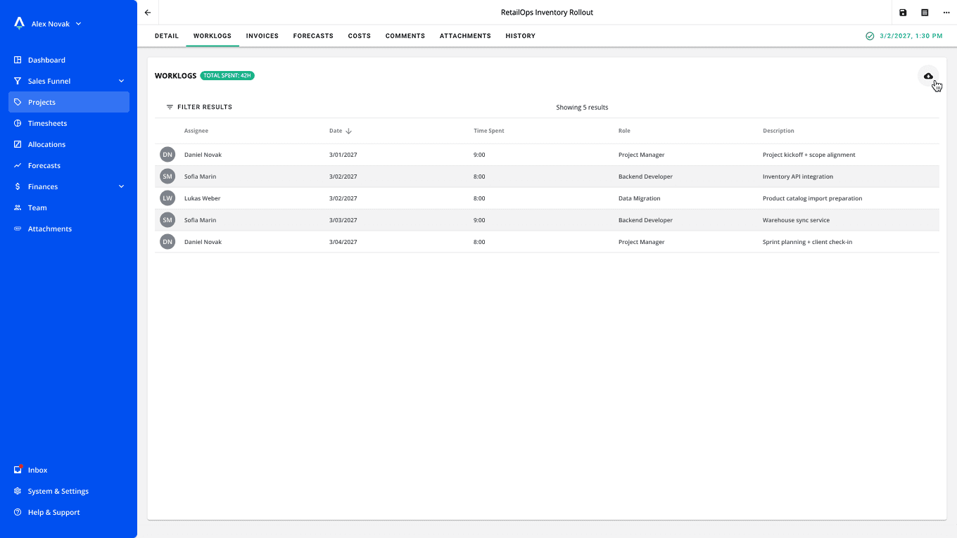 Worklogs feed directly into invoices, forecasts, and the Business Plan — ensuring that financial reporting reflects reality.